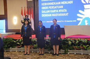Ketua Presidium DPP WKRI Justina Rostiawati didampingi Presidium DPD Jakarta, Yanti Paulus, Miranda, Klara, Pastor Budi Santoso sebagai Penasihat Rohani dan Ketua OC Elisabeth Sudarmi memukul gong sebagai tanda dibukanya Konferda XV ini.