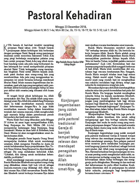 Allah menghendaki agar manusia hidup dalam persekutuan penuh bersaudara dan kasih satu sama lain. Warta Kitab Suci yang dibacakan pada Minggu IV Adven ini amat tegas memperlihatkan Allah, Sang Penjumpa itu. Nabi Mikha (Mi 5:2-5a) memperjelas kedatangan Sang Penjumpa, Sang Immanuel.