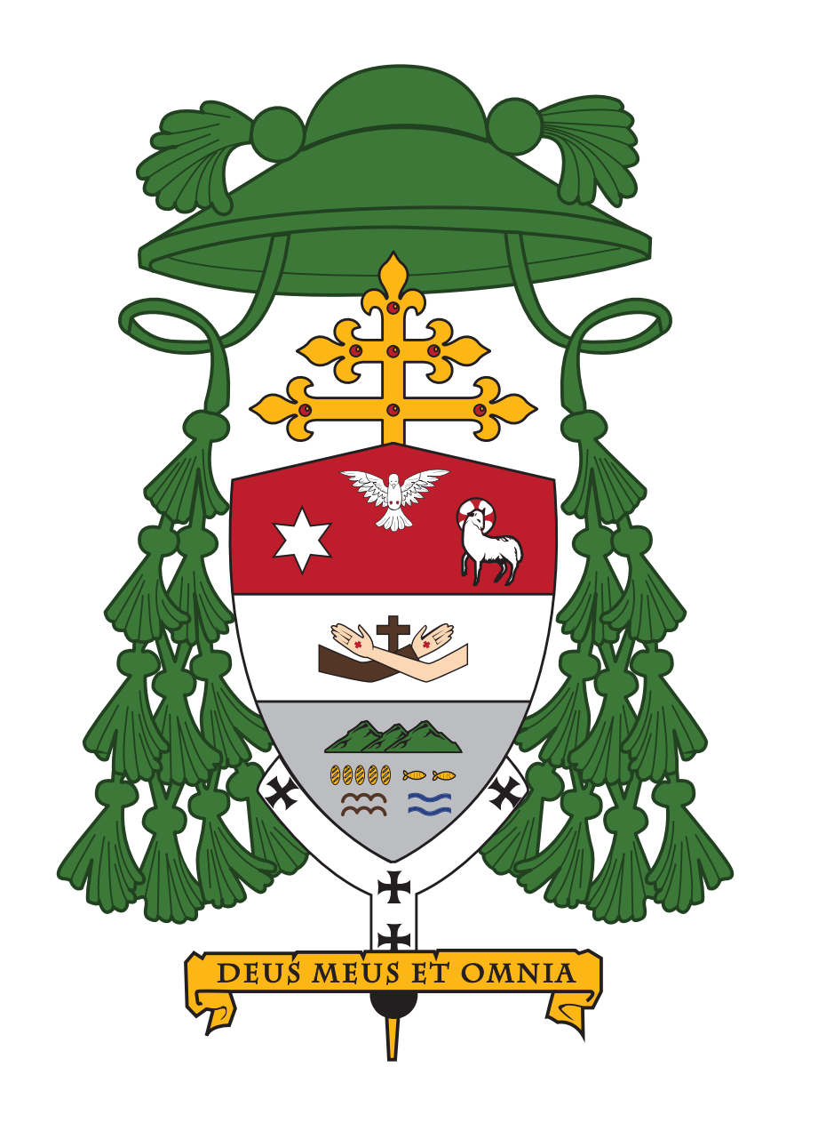Di atas perisai ditempatkan sebuah galero atau topi khas klerus berwarna hijau, dengan 10 jumbai pada masing-masing sisinya. Di bagian tengah belakang perisai adalah sebuah salib pancang berwarna kuning keemasan, dengan dua palang mendatar.