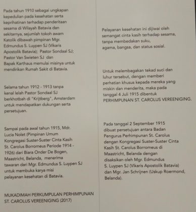 HIDUPKATOLIK.COM – Benih cinta kasih mulai bertumbuh ketika Kongregasi Suster-suster Cinta Kasih St. Carolus Borromeus (CB) dan Badan Pengurus Perhimpunan St Carolus disahkan oleh Mgr Edmundus Sybrandus Luypens, SJ selaku Vikaris Apostolis Batavia, dan Mgr Jan Schrijnen Uskup Roermond yang membawahi Kongregasi CB di Maastricht, Belanda, pada 2 September 1915.