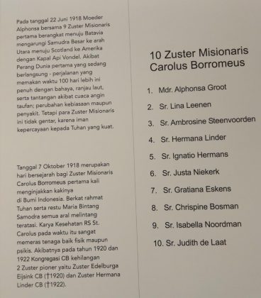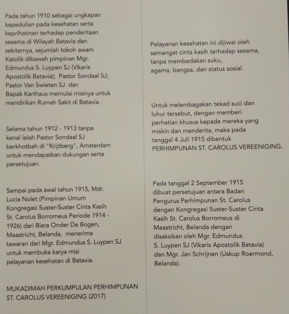 Hingga pada 22 Juni 1918, usai Perang Dunia I, 10 Suster CB memulai perjalanan selama sekitar 3,5 bulan, dari negeri Belanda menuju tanah misi Indonesia. Mereka menjejajakkan kaki di Tanjung Priok pada 7 Oktober 1918. Tepat pada 21 Januari 1919 Rumah Sakit (RS) St Carolus resmi dibuka untuk umum, dengan kapasitas 40 tempat tidur pada masa itu.