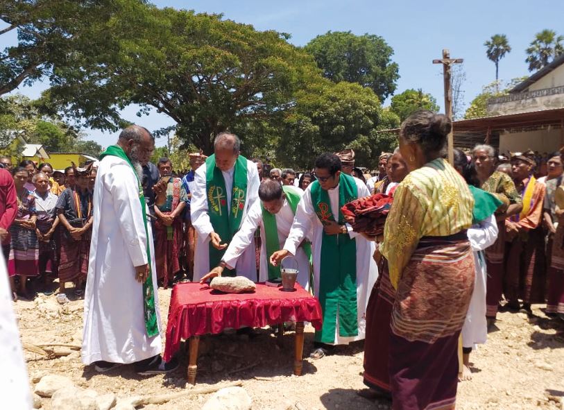 HIDUPKATOLIK.COM – VIKARIS Jenderal Keuskupan Atambua, Pastor Vinsen Wun SVD memimpin Misa peletakkan batu pertama pembangunan Gereja baru Paroki Santa Sesilia Kotafoun, Minggu, 25/11. Dalam khotbahnya, mantan Provinsial SVD Timor ini menggaris-bawahi soal makna kehadiran gereja.