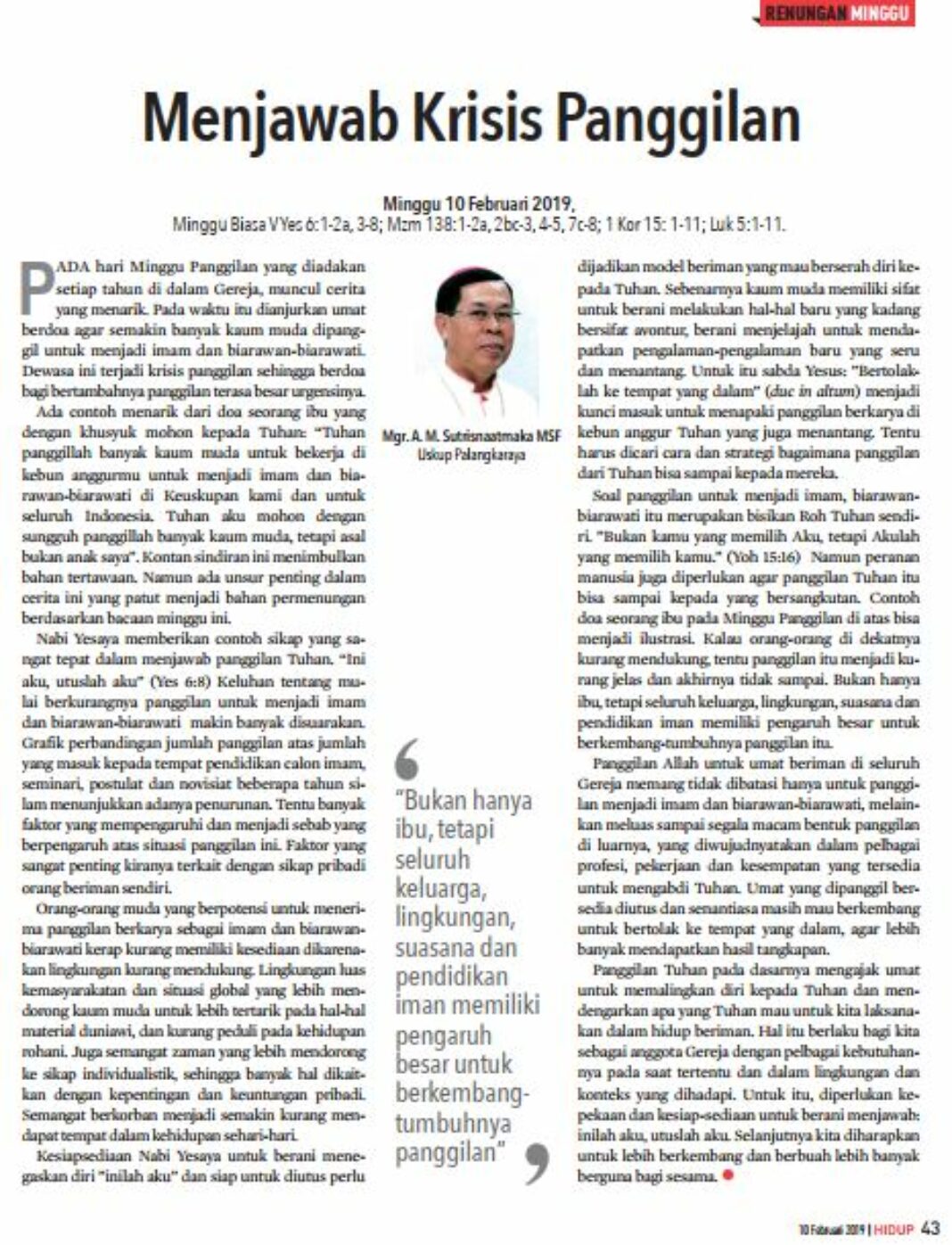 Namun, kebersamaan kita dengan Pastor Frans kini telah berakhir. Ia wafat pada usia 75 tahun pada Senin lalu, 3/12. Semasa hidupnya, banyak umat mengalami kegembiraan dan penghiburan ketika bertemu dengannya. Kini, penampilannya yang sederhana, apa adanya akan tetap menjadi kenangan.