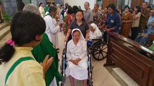 Para suster yang memakai kursi roda juga tampak diantar ke depan altar untuk menerima sakramen pengurapan.