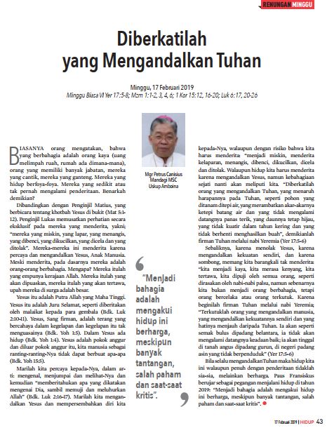 HIDUPKATOLIK.com – Minggu, 17 Februari 2019, Minggu Biasa VI Yer 17:5-8; Mzm 1:1-2, 3, 4, 6; 1 Kor 15:12, 16-20; Luk 6:17, 20-26