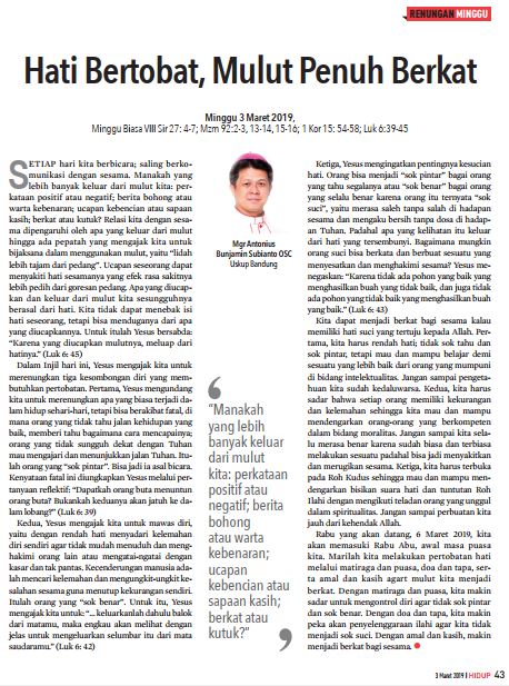 “Manakah yang lebih banyak keluar dari mulut kita: perkataan positif atau negatif; berita bohong atau warta kebenaran; ucapan kebencian atau sapaan kasih; berkat atau kutuk?”