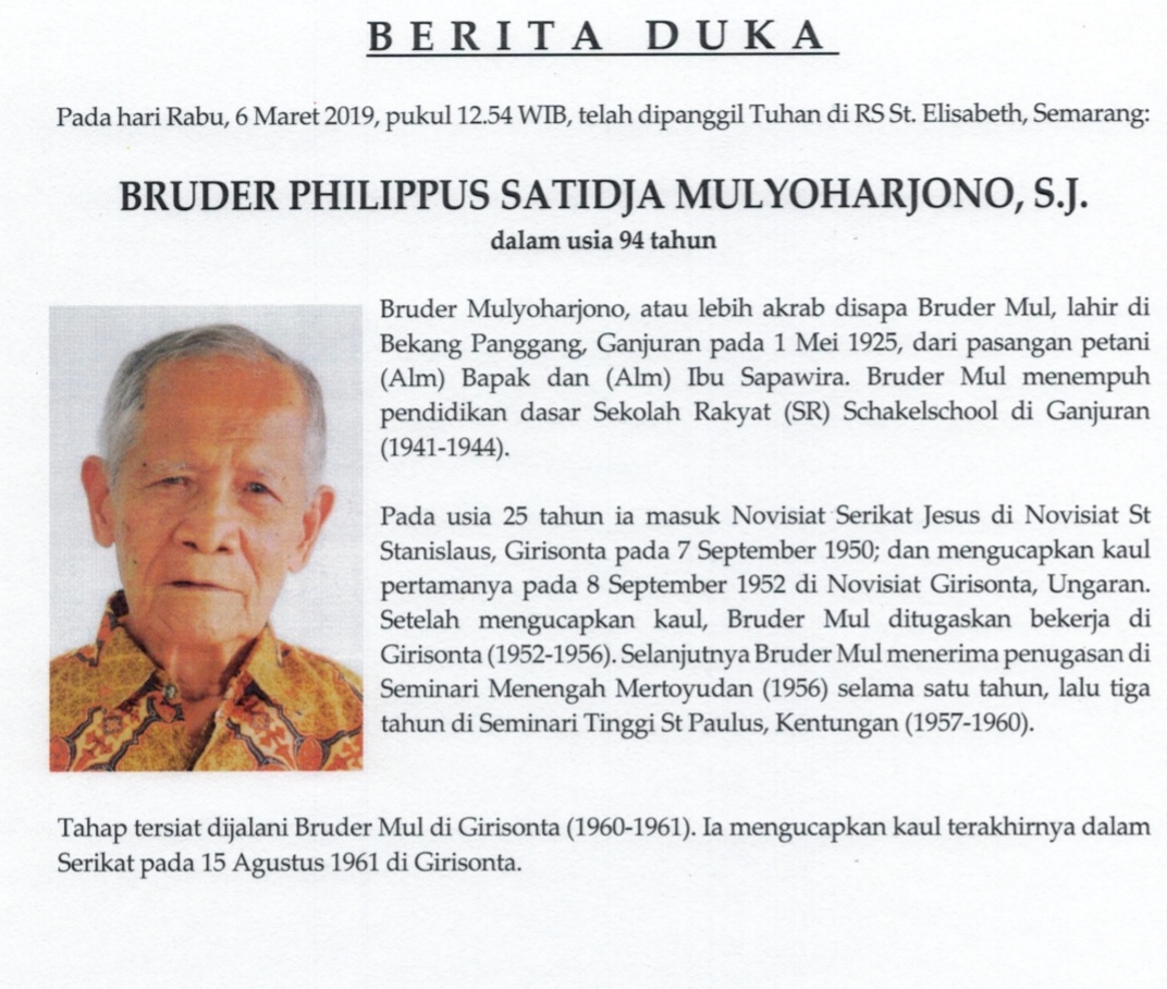 “Pada hari ini Rabu 6 Maret 2019, jam 12.54 WIB, telah menghadap Bapa di surga, Br Philippus Satidja Mulyoharjono, S.J. dalam usia 94 tahun di Rumah Sakit St. Elisabeth, Semarang.
