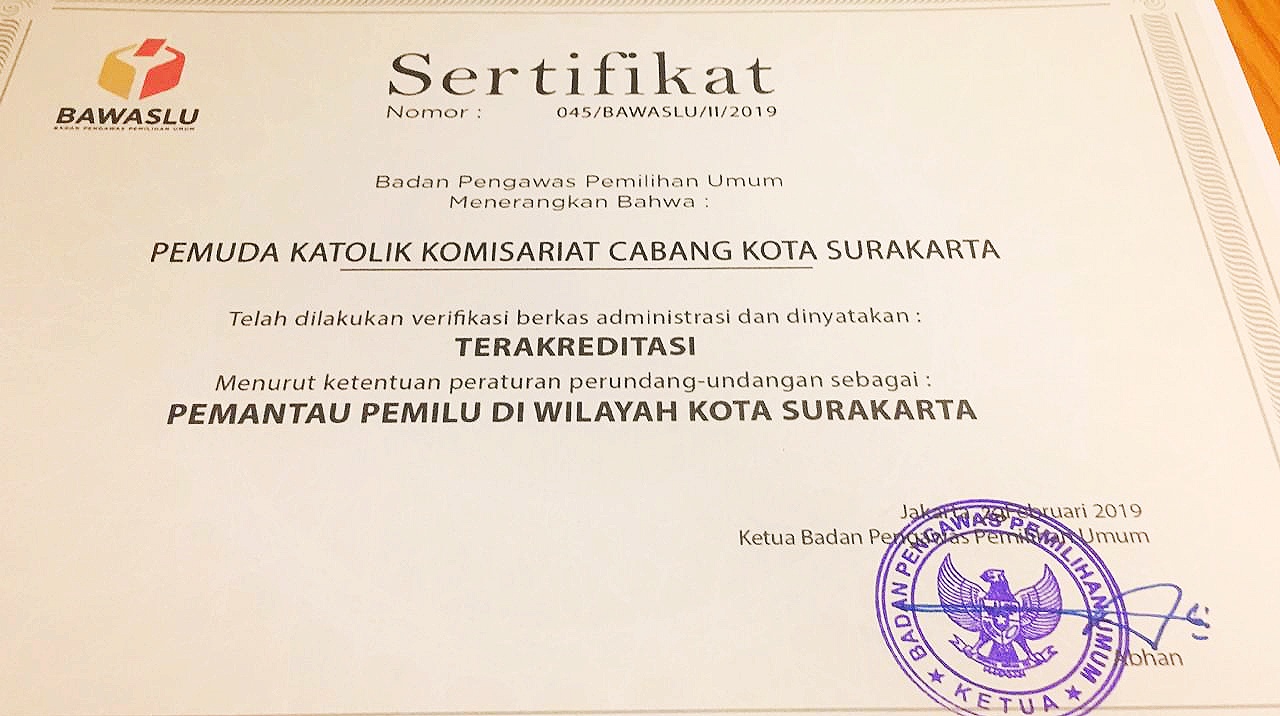 HIDUPKATOLIK.com – Pemuda Katolik (PK) Komisariat Cabang (Komcab) Kota Surakarta telah Terakreditasi sebagai Pemantau Pemilu di Wilayah Kota Surakarta.