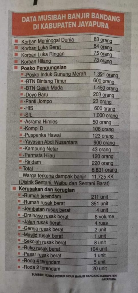 Laporan sementara bencana juga disampaikan oleh Humas Posko Induk Banjir Bandang Kabupaten Jayapura, Kantor Bupati Gunung Merah Sentani Provinsi Papua (telpon 08124812808) sebagai berikut:
