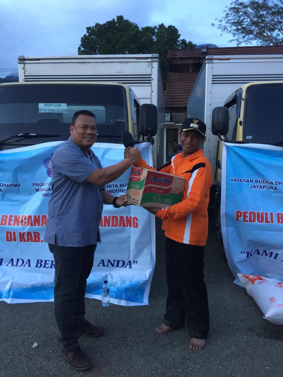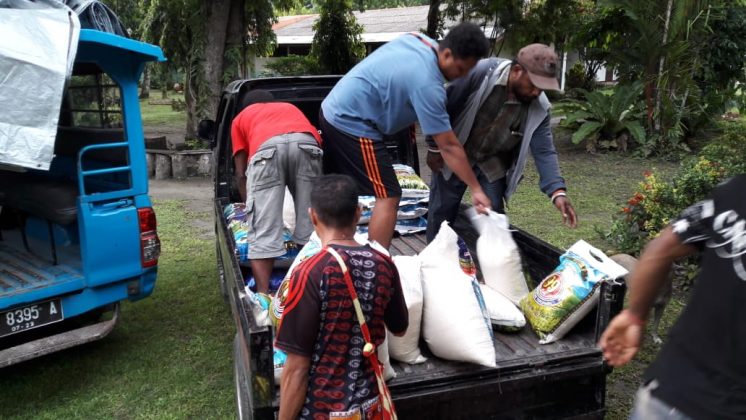 Ketua Komsos Jayapura Pastor Gok Lian, OFM menyerahkan bantuan langsung kepada Wakil Bupati Kabupaten Sentani pada Senin (18/3/2019), bertempat di posko induk bantuan di halaman Kantor Bupati Gunung Merah.
