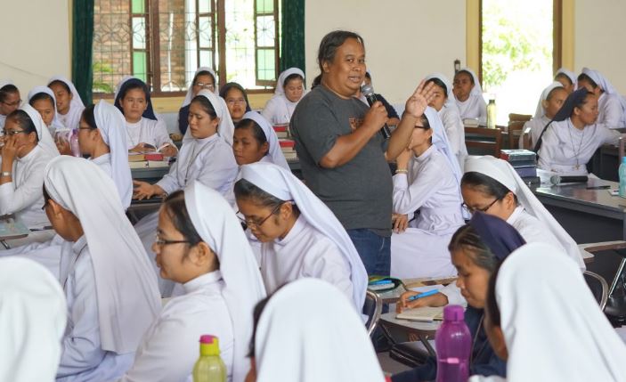 Romo Murti SJ dari SAV Puskat, Yogyakarta, menyampaikan materi “Bijak Bersosial Media” di tengah para Suster FCJM di Pematang Siantar, Sumatera Utara, 19/3/2019. [mirifica.net]