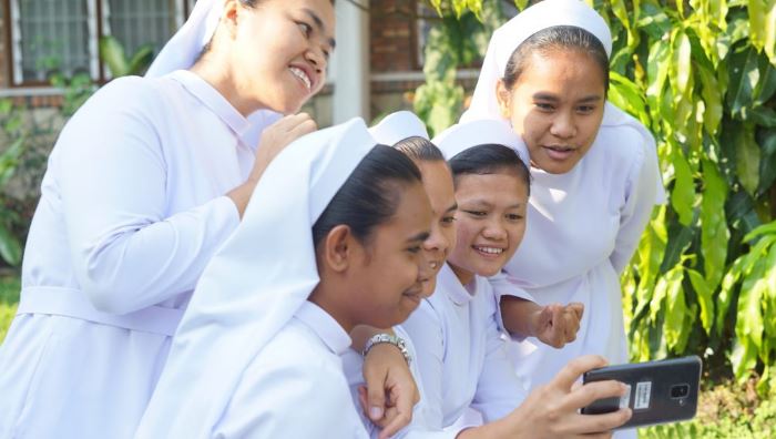 Para peserta tengah berlatih mengambil “wefie” dalam Workshop “Bijak Bersosial Media” di biara Provinsialat FCJM Monteluco di Pematang Siantar, Sumatera Utara, 18-20 Maret 2019. [dok.mirifica.net]
