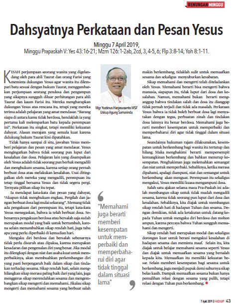 HIDUPKATOLIK.com – Minggu 7 April 2019, Minggu Prapaskah V: Yes 43:16-21; Mzm 126:1-2ab, 2cd, 3, 4-5, 6; Flp 3:8-14; Yoh 8:1-11.