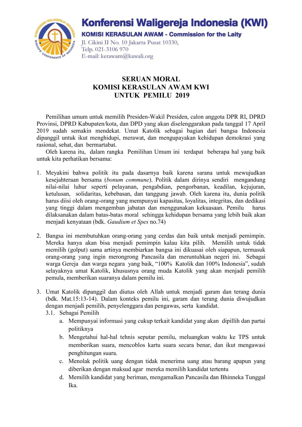 Sumber: http://www.dokpenkwi.org/wp-content/uploads/2019/03/Seruan-Moral-Komisi-Kerasulan-Awam-KWI-untuk-Pemilu-2019.pdf