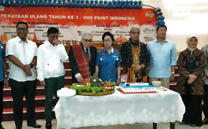 HIDUPKATOLIK.com – Ketua Umum Vox Populi Institut (VoxPoint) Indonesia, Yohanes Handojo Budhisedjati, memotong tumpeng untuk menandai ulang tahun ke-3 VoxPoint, di aula SMP St Maria Juanda, Jakarta Pusat, Minggu 31/3.