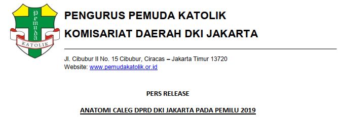 HIDUPKATOLIK. COM – Demi mewujudkan Pemilu 2019 yang semakin berkualitas, Pengurus Pemuda Katolik (PK) Komisariat Daerah (Komda) DKI Jakarta melalui rilis pers pada Senin (15/4) menyampaikan kajian berupa anatomi calon legislatif (caleg) DPRD Provinsi DKI Jakarta pada Pemilu 2019.