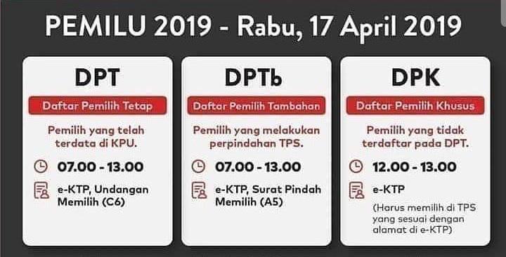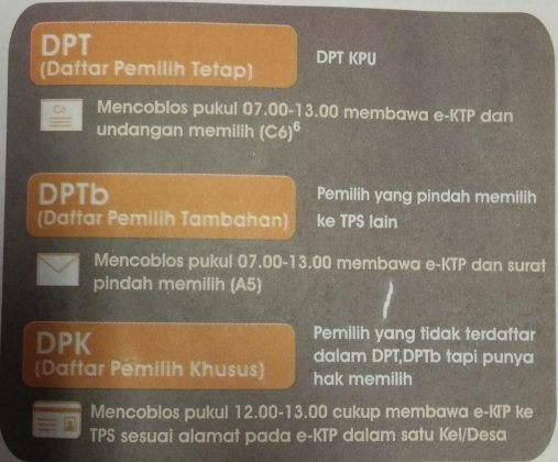 1. Daftar Pemilih Tetap (DPT) yakni Pemilih yang terdaftar di DPT dan mendapatkan C6. Bagi pemilih yang telah terdaftar dalam DPT dan menerima C6 (surat pemberitahuan pemungutan suara kepada pemilih), maka pemilih dapat langsung mendatangi TPS.