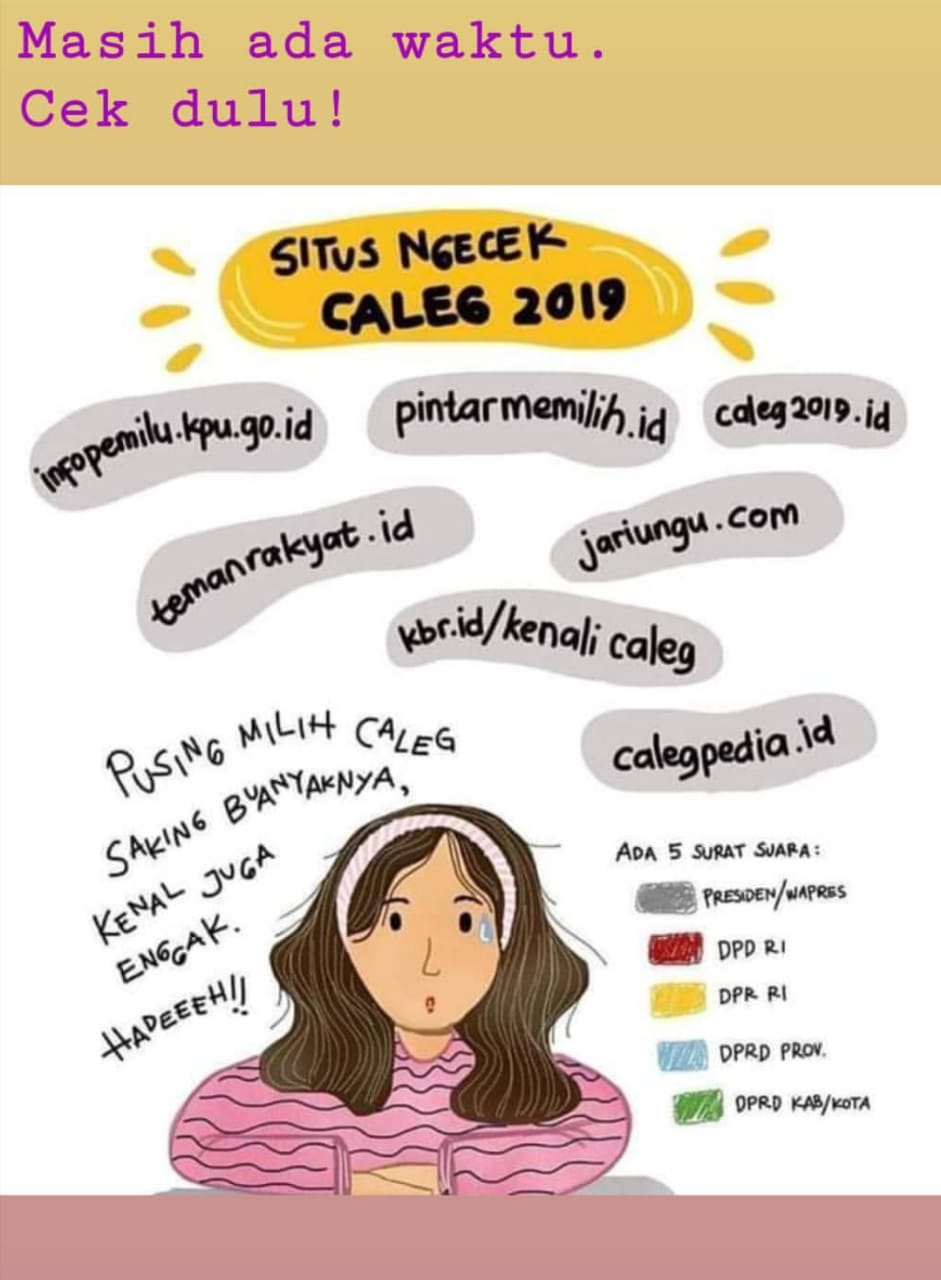 Barangkali anda pernah menyaksikan pada layar tv, acara debat Presiden. Selain memilih Presiden dan wakilnya, apakah kita sudah menentukan siapa calon legislatif yang ingin kita pilih? Sejauh mana kita membekali diri untuk ikut menyukseskan Pemilu ini?