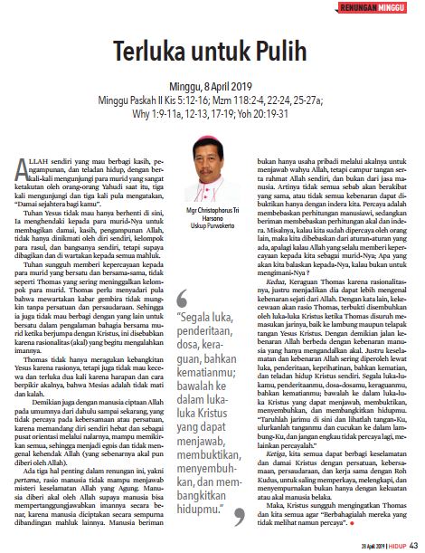 HIDUPKATOLIK.com – Minggu, 8 April 2019, Minggu Paskah II Kis 5:12-16; Mzm 118:2-4, 22-24, 25-27a; Why 1:9-11a, 12-13, 17-19; Yoh 20:19-31