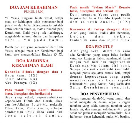 Selain doa Angelus (Malaikat Tuhan) yang kita doakan di masa prapaskah atau doa Ratu Surga (di masa Paskah), kita juga dapat mendaraskan doa pada setiap pukul 3 siang, seuntai doa Kerahiman Ilahi berikut ini: