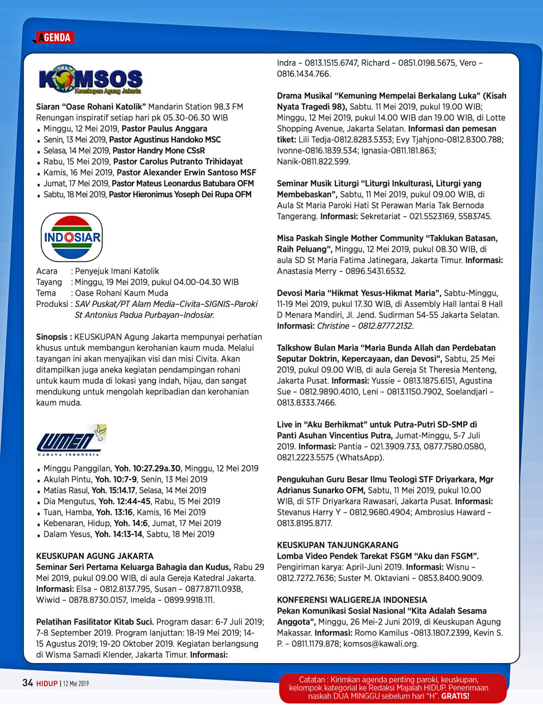 (RD. Samuel Pangestu – Lucy pada program “Oase Rohani Katolik” (ORK) hari SENIN ini dapat Anda SAKSIKAN dengan klik www.hidup.tv pada pk. 05.00; 08.00; 11.00, 14.00, 17.00, 20.00, 23.00 WIB, dst; Anda dengarkan di RADIO: MANDARIN STATION 98.3 FM atau klik www.radio.kaj.or.id pk.06.00; 12.00; 18.00 WIB). Silakan share.