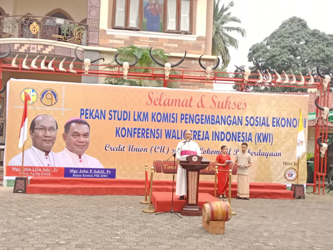 HIDUPKATOLIK.COM— Tepukan riuh menyambut pernyataan Uskup Agung Makassar, Mgr John Liku-Ada ketika memberi pidato pembukaan dalam acara penyambutan resmi rombongan Komisi Pengembangan Sosial Ekonomi Konferensi Waligereja Indonesia (PSE KWI). Penyambutan secara adat khas Toraja ini dilaksanakan di Paroki Hati Tak Bernoda St Perawan Maria Makale pada hari Selasa, 9/7. Kedatangan sekitar 120 peserta dari berbagai keuskupan di Indonesia adalah dalam rangka menghadiri Pekan Studi LKM Komisi PSE KWI bertajuk: “Credit Union (CU) sebagai lokomotif pemberdayaan umat.”