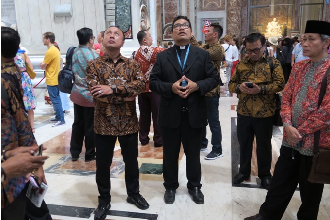 Komjen Polisi Agung Budi Maryoto (kiri) mengunjungi Basilika Santo Petrus didampingi oleh Pastor Markus (kanan menggunakan baju hitam). [Dok.KBRI untuk Takhta Suci ]Selain bertemu dengan pejabat Vatikan, delegasi Baintelkam Polri berkesempatan mengunjungi Basilika Santo Petrus dengan didampingi oleh Direktur Desk Islam Asia dan Pasifik Takhta Suci Vatikan Pastor Markus Solo Kewuta. Juga, mereka menghadiri makan malam dan silaturahmi yang diselenggarakan oleh KBRI untuk Takhta Suci. Pada jamuan makan malam tersebut, Duta Besar RI untuk Takhta Suci, A Agus Sriyono, menjelaskan berbagai kegiatan KBRI dalam kerangka mengembangkan dialog antaragama yang berlandaskan nilai-nilai kemanusiaan.
