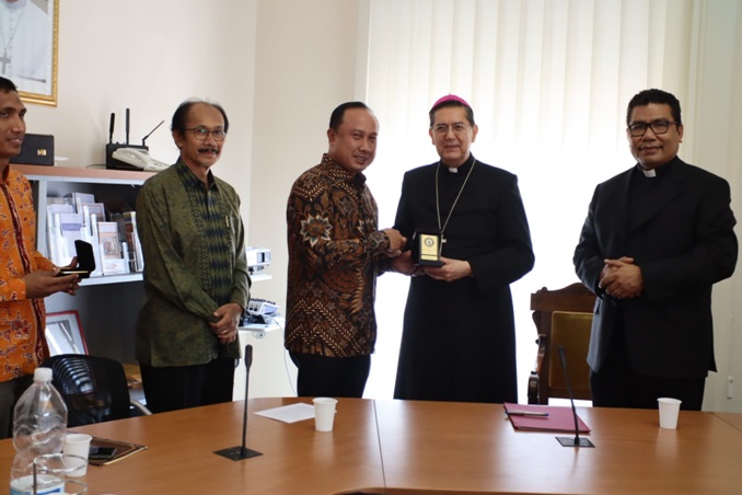 Penyerahan Cenderamata kepada Mgr. Ayuso (kedua dari kanan) oleh Komjen Polisi Agung Budi Maryoto (kedua dari kanan) yang didampingi Dubes RI untuk Takhta Suci, A Agus Sriyono (kiri) dan Pastur Markus (kanan)