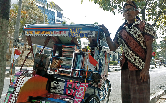 HIDUPKATOLIK.com – Becak Mbah Topo amat berbeda dari becak-becak lain. Ada perpustakaan di dalam kendaraan beroda tiga itu. Becak itu juga membawa keberuntungan.