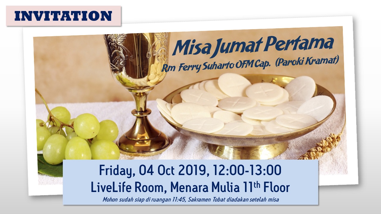 21. MISA JUMAT PERTAMA: KITA DIPANGGIL UNTUK SETIA, 04 Oktober 2019, pukul 12:00-13:00 WIB (mohon sudah di ruangan 11:45 WIB) di Ruang Live Life, Menara Mulia 11th Floor, Jl.Jend.Gatot Soebroto, dipimpin oleh Romo Ferry Suharto, OFM.