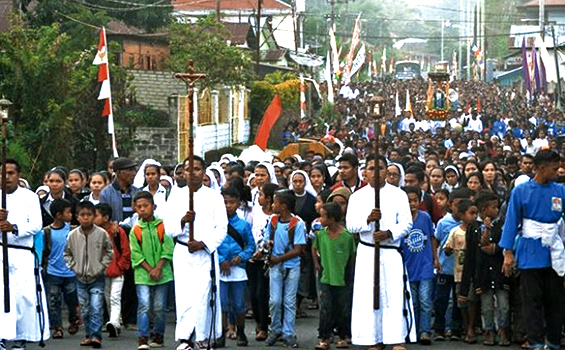 Hujan lebat sempat mengguyur Kota Ruteng, Flores, Nusa Tenggara Timur (NTT), Jumat, 18/10. Kendati begitu halaman gereja Paroki St Vitalis Cewonikit, Ruteng, telah penuh sesak oleh umat Katolik. Merekadatang dengan menggunakan busana adat Manggarai, sambil membawa rosario dan buku doa. Hari itu umat mengarak patung Bunda Maria dari Paroki Cewonikit menuju Gereja Katedaral Santa Maria Assumpta Ruteng.
