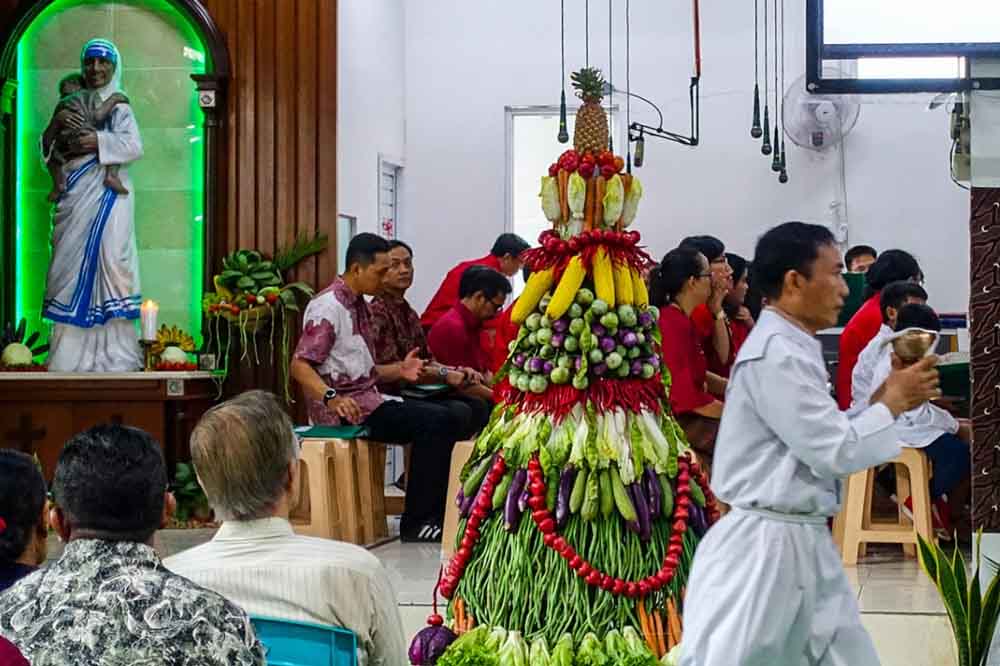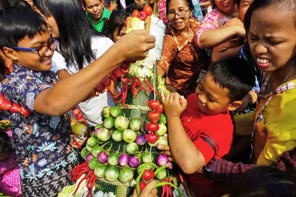 Ratusan orang berebut sayur dan buah-buahan dalam bentuk gunungan setinggi dua meter yang telah diberkati oleh Romo Antonius Suhardi Antara Pr, di halaman Gereja Ibu Teresa Paroki Cikarang, Minggu (20/10). Acara ini dalam memperingati Hari Pangan Sedunia (HPS) atau World Food Day 2019. Bertemakan “Mencintai Pangan Lokal, Ayo! Konsumsi Pangan Sehat Segar dan Sejahtera”, semua pihak diminta ikut memastikan kemananan pangan dan pola pangan sehat tersedia untuk semua orang.