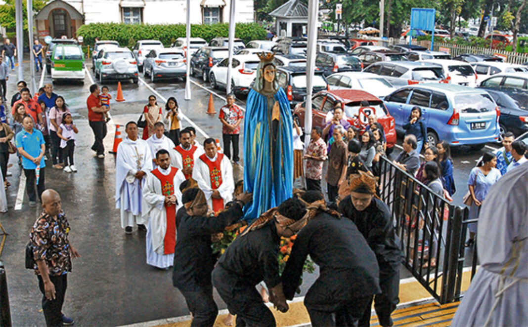 HIDUPKATOLIK.com – Langit senja mulai mendung, rintik hujan mulai turun. Namun hal itu tidak menggentarkan semangat ratusan umat yang akan merayakan Pesta Nama Paroki Katedral Santa Perawan Maria, Bogor, Jawa Barat. Puluhan vandel berjejer berdampingan, berhiaskan ciri khas wilayah, komunitas, dan seksi kebanggaan Gereja Katedral. Derap langkah para pembawa vandel ditemani gemericik hujan memasuki pintu Gereja.