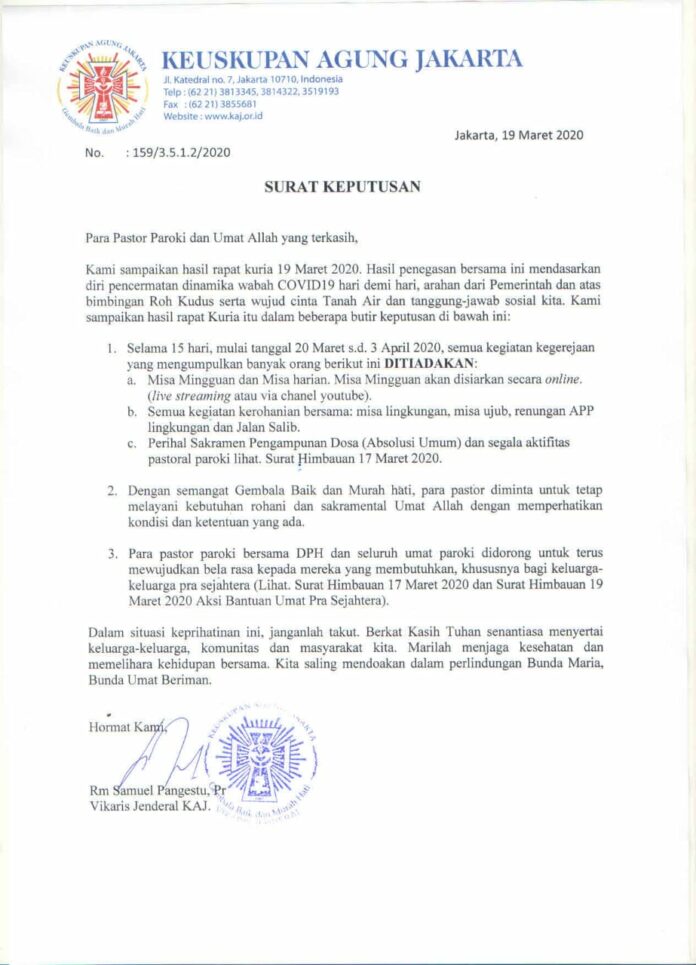 HIDUPKATOLIK.com – Menindaklanjuti penyebaran COVID 19, Keuskupan Agung Jakarta (KAJ) mengeluarkan Surat Keputusan yang bertanda tangan atas nama Vikaris Jendral KAJ Romo Samuel Pangestu dan ditujukan kepada para romo paroki dan umat. Berikut beberapa hal yang disampaikan;