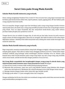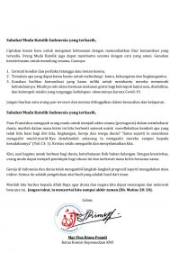 Untuk itu, imbauan bagi orang muda pun diberikan dalam surat cinta ini diantaranya dengan berdiam di kos/rumah, terutama tidak mudik/pulang kampung halaman, menunda dulu pertemuan, rapat atau acara yang dihadiri banyak orang (menggantinya secara daring atau telekonferensi), membatasi diri untuk berkumpul secara fisik dengan teman-teman, menjaga stamina dengan makan sehat, tetap olah raga, berpikir positif, menjaga jarak sekitar 1.5 (satu setengah) meter dari orang lain.