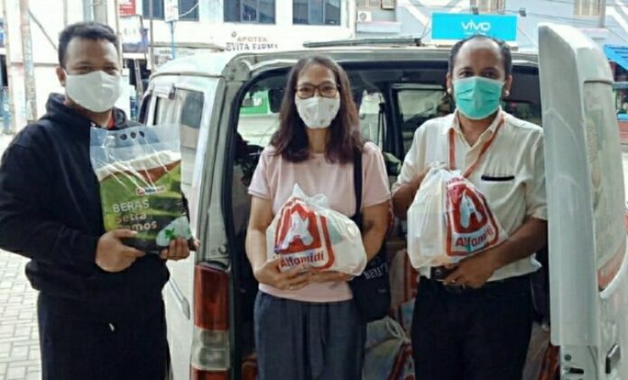 Dalam proses penyaluran bantuan bekerja sama dengan Mini Market Alfamidi di Bekasi.