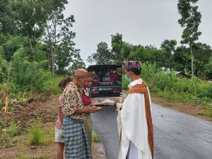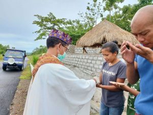 Pastor Kasmir SMM membagikan hosti kepada umat di pinggir jalan/Dok. Pribadi