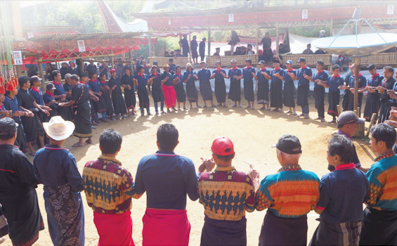 Ratusan orang dengan sarung hitam gelap berjalan beriringan menuju kumpulan rumah tongkonan. Terlihat area itu didominasi oleh warna merah dengan benang emas. Para tamu yang terdiri dari sanak saudara, handai taulan, bahkan orang asing pun disambut dengan kehangatan yang sama. Keluarga yang berduka merasa diberkati ketika banyak orang datang mendoakan almarhum yang sudah meninggal.