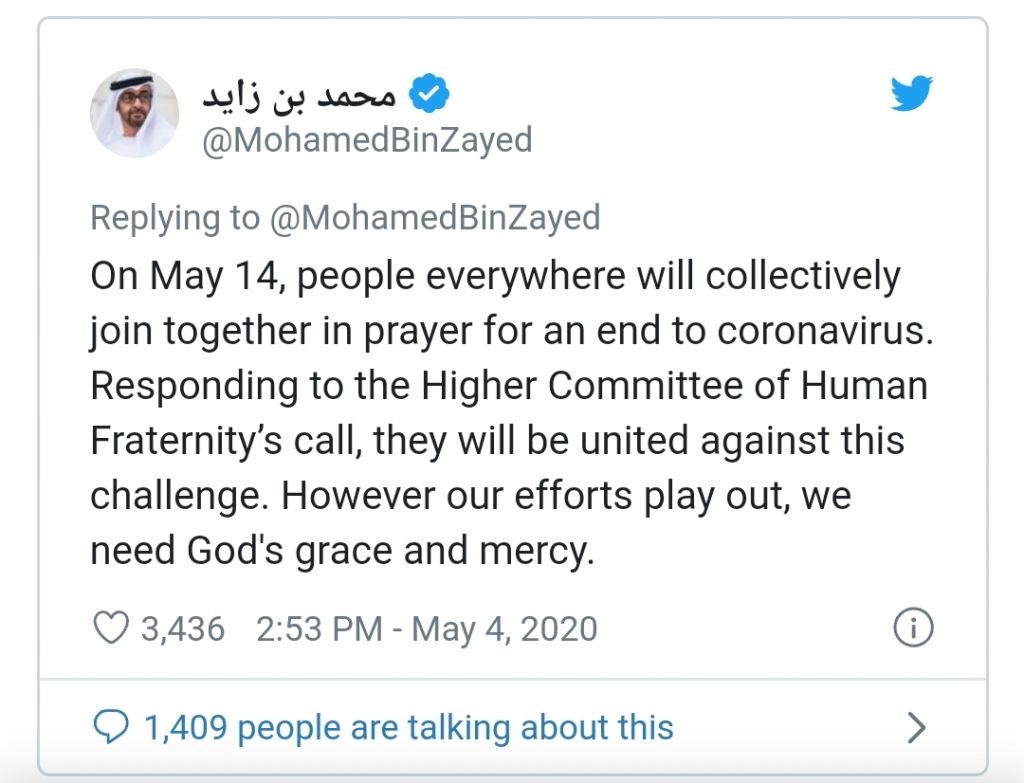 Dukungan Paus Fransiskus kepada inisiatif Komisi untuk berdoa dan berpuasa bersama pada 14 Mei juga didiukung Putra Mahkota Abu Dhabi Sheikh Mohamed bin Zayed Al Nahyan. Dalam cuitannya di Twitter pada Senin, 4 Mei 2020, Sheikh Mohamed mengatakan, 14 Mei mendatang bakal menjadi hari yang mempersatukan seluruh umat beriman untuk menghadapi pagebluk Covid-19.