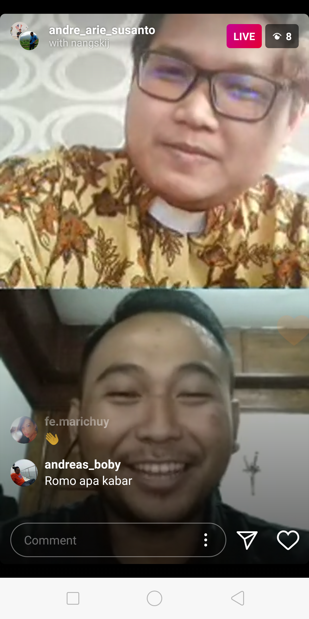 Keduanya, Romo Andreas Arie Susanto dan Romo Agustinus Wimbodo Purnomo mengapresiasi keputusan Paus Fransiskus untuk berkontribusi dalam gerakan #prayforhumanity yang diadakan Komisi Tinggi Persaudaraan Manusia. Romo Arie melihat gerakan doa bersama ini akan mencegah manusia untuk tercabut dari akar kemanusiaannya akibat persepsi negatif penuh kecemasan yang ditimbulkan virus korona. “Saat ini, krisis kemanusiaan timbul bukan hanya karena masalah kesehatan, tetapi krisis penolakan terhadap manusia lain. Gambaran Paus mengenai doa adalah nilai universal diharapkan dapat membenahi alam pikir manusia agar tak memberikan sanksi sosial yang tak beralasan akibat curiga berlebih,” ujar imam yang bertugas di Paroki St. Maria Tak Bernoda Rangkabitung ini. Ia juga bersyukur dengan adanya doa kebangsaan karena gerakan ini mampu mendobrak sekat-sekat perbedaan dan mengembalikan lagi semangat solidaritas kemanusiaan sebagai manusia Indonesia.