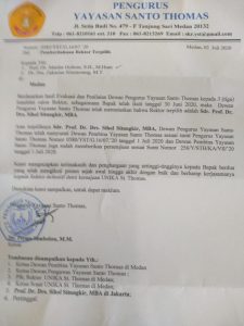“Dewan Pengurus Yayasan Santo Thomas Medan memutuskan bahwa rektor terpilih adalah Sdr. Prof. Dr. Drs. Sihol Situngkir, MBA,” demikian isi surat dimaksud.