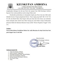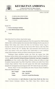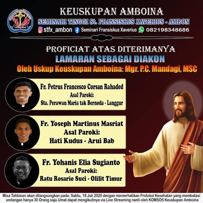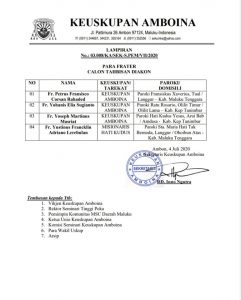 Pernyataan ini disampaikan langsung Sekretaris Keuskupan Amboina Pastor Inno Ngutra dalam surat pemberitahuan tahbisan diakon dengan nomor 03.008/KA/SEK/-S.PEM/VII/2020.