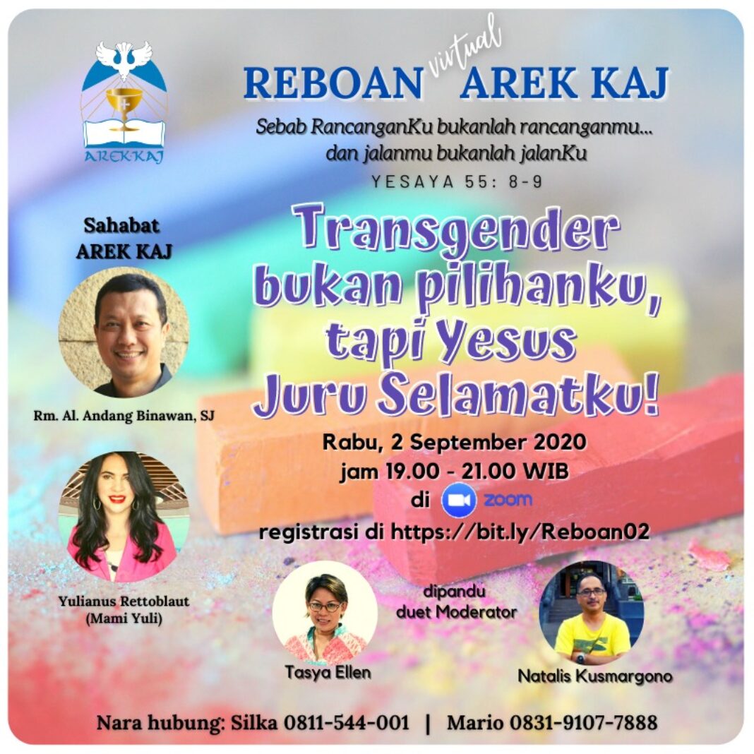 Acara yang bertemakan “Transgender bukan pilihanku, tapi Yesus Juru Selamatku” ini diadakan oleh AREK KAJ pada hari Rabu 2 September 2020. AREK-KAJ adalah sebuah lembaga yang masuk dalam kelompok kategorial Keuskupan Agung di wilayah Jakarta. Tujuannya adalah untuk menjalin kerjasama dengan PEMIKAT (Pertemuan Mitra Kategorial), dengan misi untuk memberikan pelayanan rohani kepada para eksekutif dan juga masyarakat umumnya.