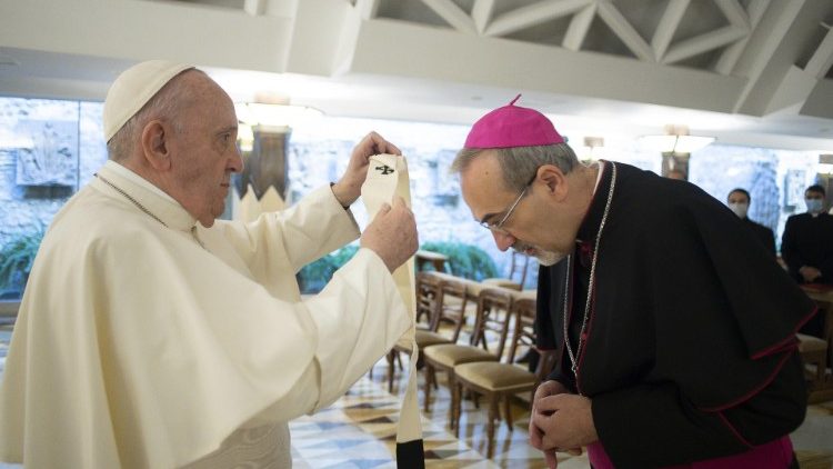Dalam salam untuk keuskupannya, Patriark Pizzabella berkata: “Pallium ini mengingatkan kita bahwa kita telah memilih dalam Baptisan untuk memikul kuk Kristus, beban dan kemuliaan Salib, yaitu kasih yang diberikan sampai mati hingga alam baka.”