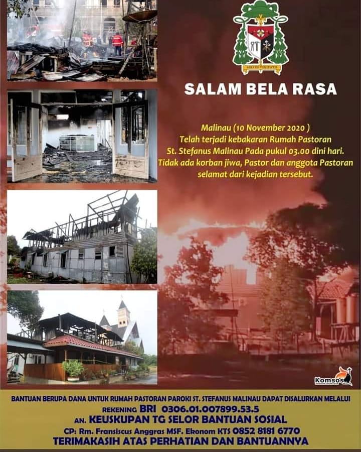 Rumah Pastoran Paroki St. Stefanus, Malinau terbakar pukul 03.00 WITA, Selasa 10 November 2020. Berdasarkan informasi yang didapat dari Mgr. Yan Olla, kebakaran terjadi karena korsleting listrik dari dapur. “Pegawai di dapur mencoba untuk memadamkan, namun tidak berhasil sehingga apinya menjalar dan menghabiskan bangunan sampai lantai dua,” terang Mgr. Yan Olla ketika ditelepon Hidupkatolik.com, Selasa,10/11.