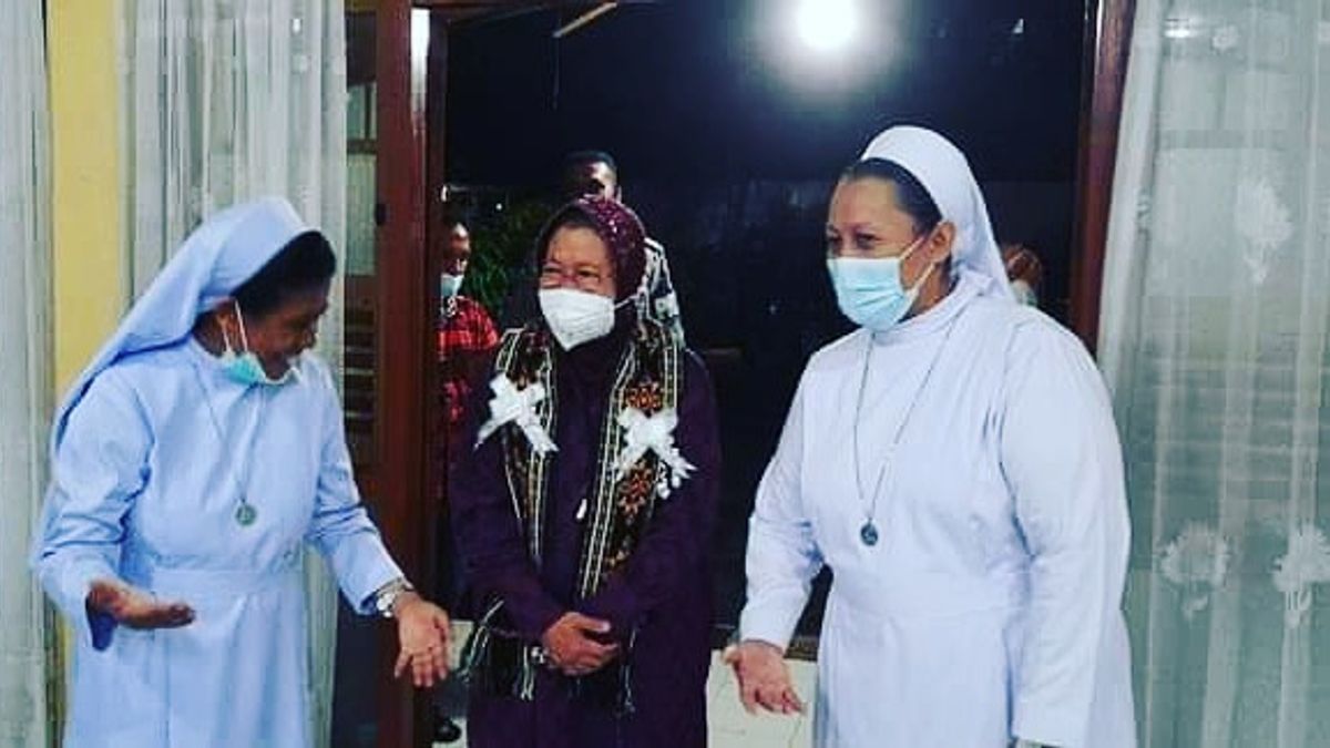 Mendapatkan kunjungan yang luar biasa ini, Risma pun tampak terharu. Ia mengatupkan tangan di dada tanda memberi salam. Tampak, para biarawati tetap mengenakan masker tanda patuh terhadap protokol kesehatan (Prokes).