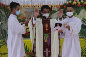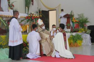 HIDUPKATOLIK.COM – USKUP Atambua, Mgr. Dominikus Saku menahbiskan Romo Edelbertus Silab di Aula Santo Dominikus, Atambua, Nusa Tenggara Timur, Senin, 31/5/2021. Walau di tengah pandemi Covid-19, perayaan Ekaristi kudus tetap mengikuti protokol kesehatan.
