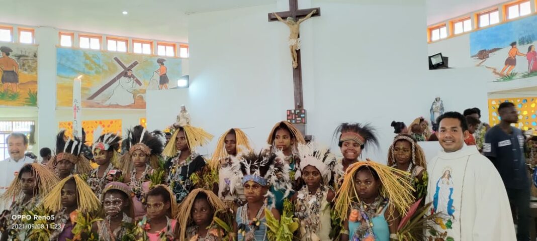 HIDUPKATOLIK.COM – RAUT wajah gembira dan sukacita terlihat pada wajah anak-anak dan orangtua yang menerima sakramen-sakramen di Paroki Kristus Raja Kimaan, Keuskupan Agung Merauke. Bertepatan dengan Hari Raya Kelahiran St. Perawan Maria, Rabu, 8 September 2021, diadakan penerimaan tiga sakramen sekaligus dalam satu Perayaan Ekaristi. Masing-masing sakramen itu adalah Sakramen Pembaptisan bagi 39 anak dan 1 dewasa, Komuni Pertama bagi 40 orang, dan Sakramen Perkawinan bagi 7 pasangan. Penerimaan tiga jenis sakramen sekaligus ini karena alasan pastoral saja, di mana ada orangtua yang baru menikah sekaligus anaknya dibapis dan terima Komuni Pertama. Perayaan Ekaristi dipimpin oleh Pastor Yohanis Elsoin dan Pastor Yakobus Priyono selaku Vikep Kimaam.