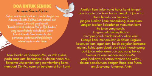 Setiap sesi Konsili Vatikan II dimulai dengan doa Adsumus Sancte Spiritus, kata pertama dari bahasa Latin asli, yang berarti, “Kami berdiri di hadapan-Mu, ya Roh Kudus,” yang secara historis telah dipakai dalam Konsili-konsili, Sinode-sinode, dan pertemuan-pertemuan Gereja lainnya selama beratus-ratus tahun, dan dikaitkan dengan Santo Isidorus dari Seville (sekitar 560 – 4 April 636). Saat kita menyambut Proses Sinode ini, doa ini mengundang Roh Kudus untuk berkarya di dalam diri kita agar kita dapat menjadi suatu komunitas dan umat yang berahmat. Untuk perjalanan Sinodal dari tahun 2021 hingga 2023, KAJ mengusulkan versi sederhana berikut ini, sehingga setiap kelompok atau pertemuan liturgi dapat berdoa dengan lebih mudah.
