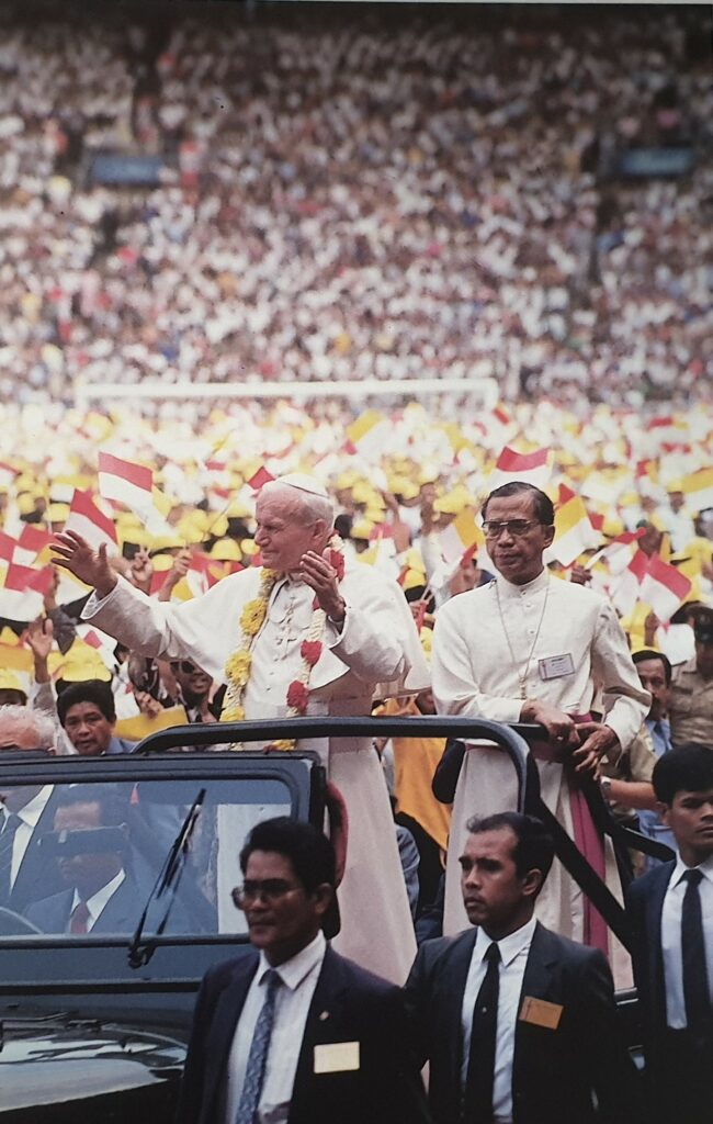 Serentak saya teringat akan sebuah tulisan yang pernah saya buat sebagai catatan kenangan akan kunjungan Bapa Suci Sri Paus Johanes Paulus II ke Indonesia 32 tahun silam yaitu pada Oktober 1989. Sri Paus Johanes Paulus II yang kini bergelar Santo Johanes Paulus atau Santo Karol Woityla, yang asal Polandia itu, mengunjungi Indonesia selama lima hari, dari tanggal 8 – 12 Oktober 1989, dengan menyinggahi Jakarta, Yogyakarta, Maumere/Flores dan Dili (Timor Timur, yang waktu itu masih propinsi ke-27 Indonesia) dan terakhir Medan. Dalam kunjungan-kunjungan ini, Sri Paus memimpin Misa agung dan berdialog langsung dengan lebih dari 1 juta orang Katolik.